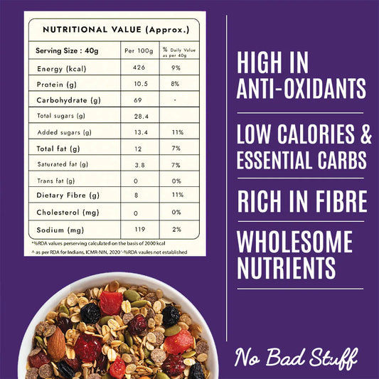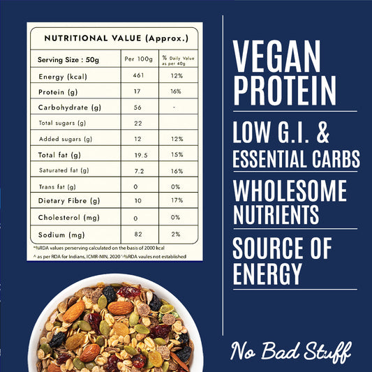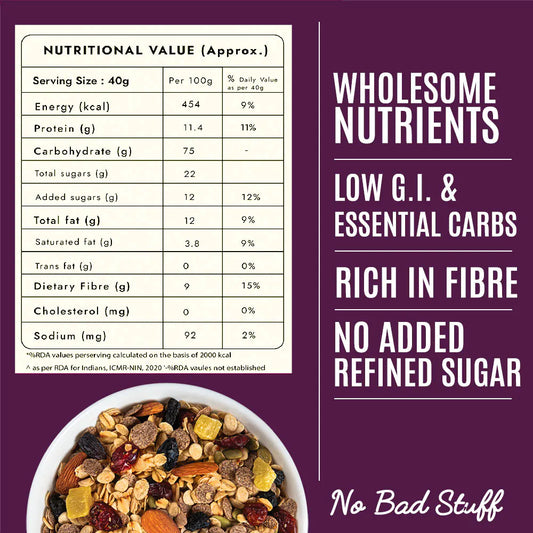 Our muesli consists of 100% whole grains, nuts, seeds, and genuine fruits—no preservatives, no artificial sugar, just clean, pure goodness in every bite.